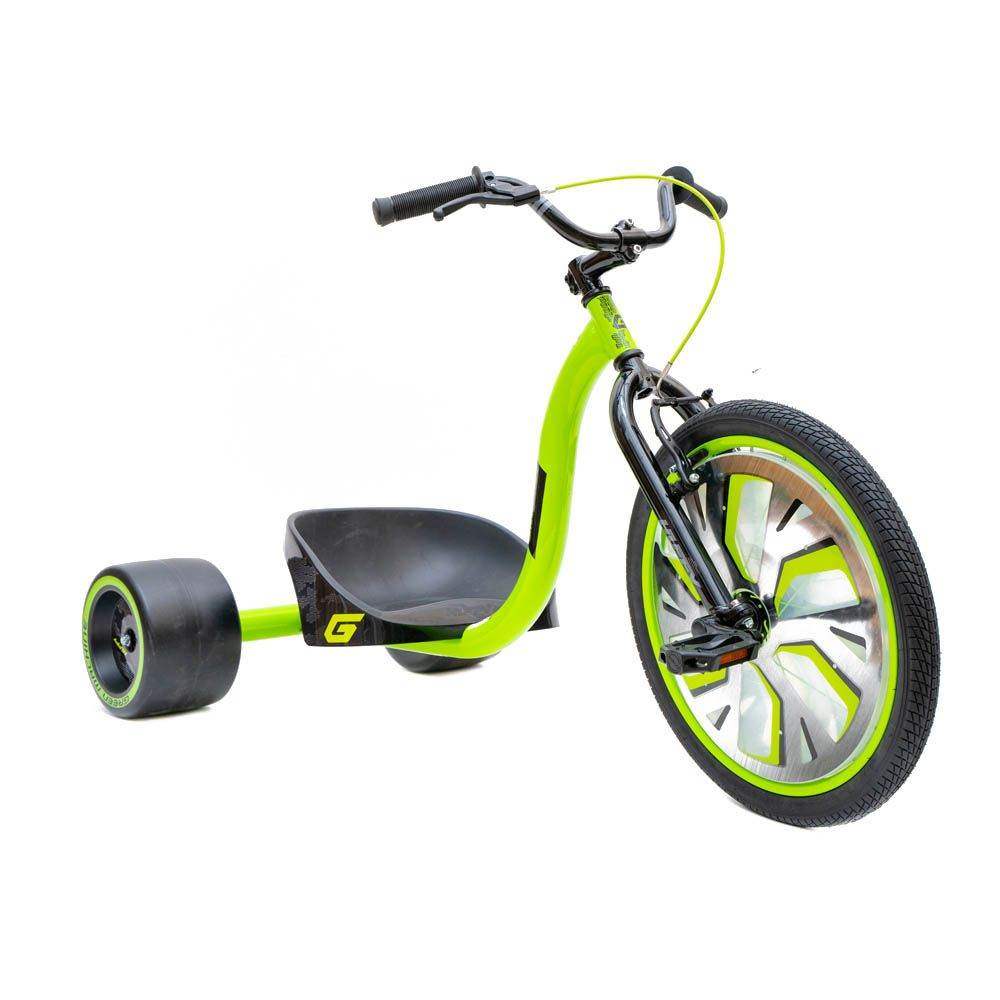 The Huffy Green Machine Slider delivers extreme drifting action, awesome slides and 180 degree spins. The rear 700g wheels of your ride on are extra-wide with a 6 inch (15.2cm) width for slick action. The front 20 inch (50.8cm) pneumatic tyre has solid traction for smooth acceleration and the durable steel frame is backed by a limited lifetime warranty. Comfortable BMX-style grips provide a firm hold whilst the comfortable bucket seat supports the rider during spins. And if you ever want to hit pause, there's the front linear pull handbrake.