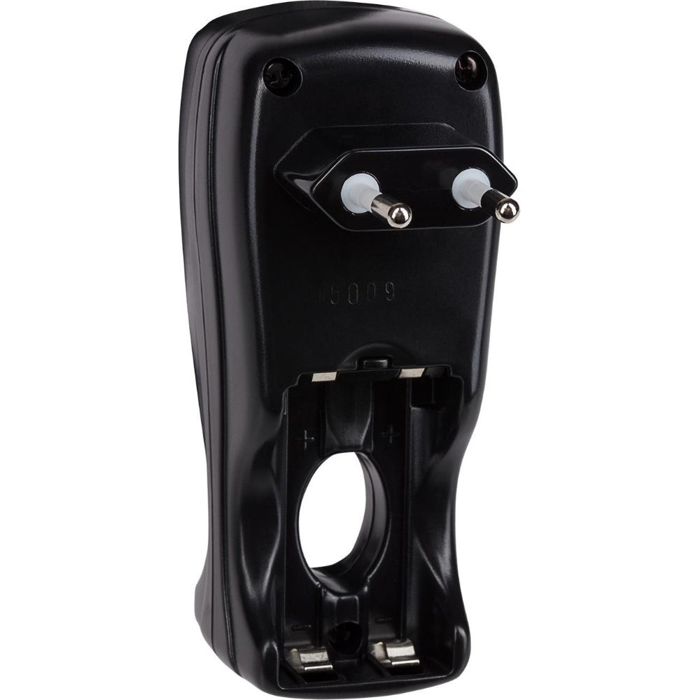 Ideal for those travelling throughout Europe, this charger is slim enough to fit alongside other plugged-in devices. 2 Batteries are inserted at the front and 2 at the back, and it has indicator lights to show which are charging. Charging time depends on the capacity of batteries.