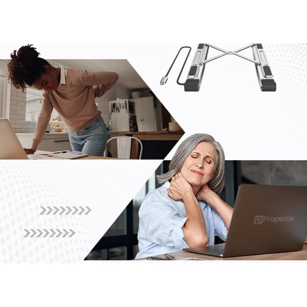 ProperAV Laptop or Tablet Stand Portable with Built in 100W USB-C Hub 4 x USB-A Port Aluminium Construction Silver