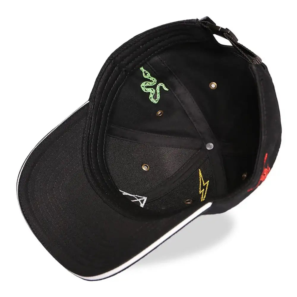 Push all boundaries of magic further the Dark Arts while wearing this adjustable cap for kids, with white sandwich bill, small details of flat embroidered icons placed all over and a woven label in the back side seam of the plastic buckle closure. Open at the back and adjustable for wearing comfort and optimal fit.